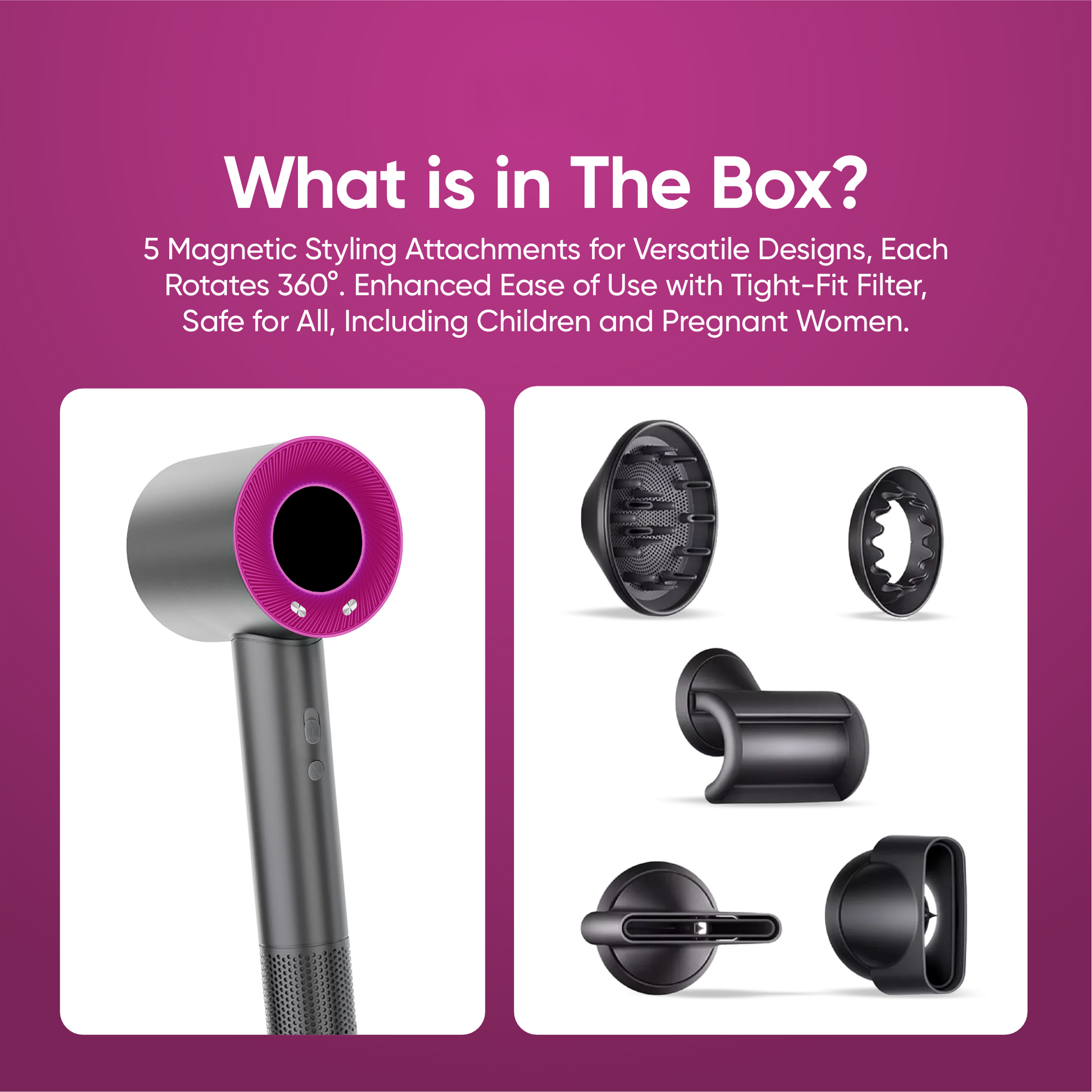 - Magnetic Attachments: Includes a smoothing nozzle, styling concentrator, and diffuser, catering to various hair types and styles.